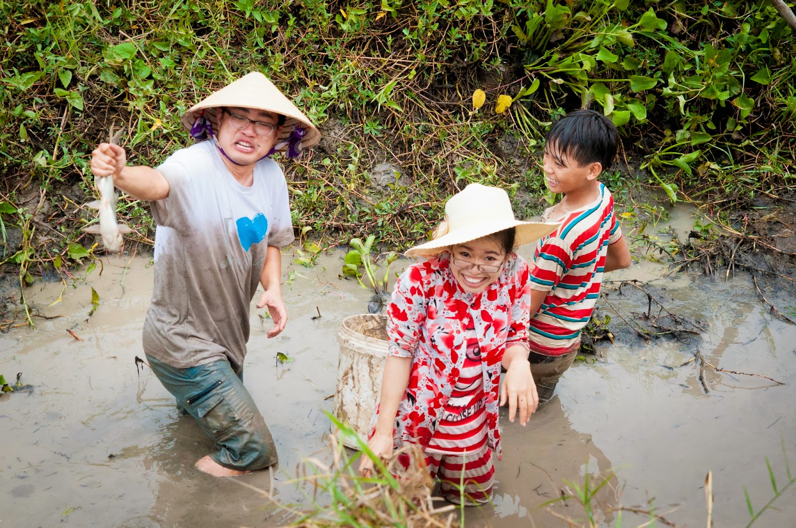 Ảnh dưới đây, 2 anh em đang lo dẹo, chưa lo mò cua, bắt ốc. Tui đang đứng vẫy tay chào như Kate Middleton (tập trước gương riết rồi, giờ mới có dịp đem ra thực hành), thì bỗng nhận ra, sao từ từ mình lùn xuống. "Chết men! Kíu cô! Kíu cô! Đất lún! Đất lún!!!" Đang la bài hãi dzậy thì quay lại thấy mấy đứa nhỏ cười sằng sặc "Hông sao đâu! Cô cứ đi tới đi lui đi, là nó hết lún!" Quả thiệt, hết lún thiệt!